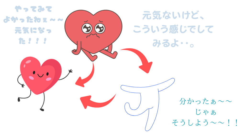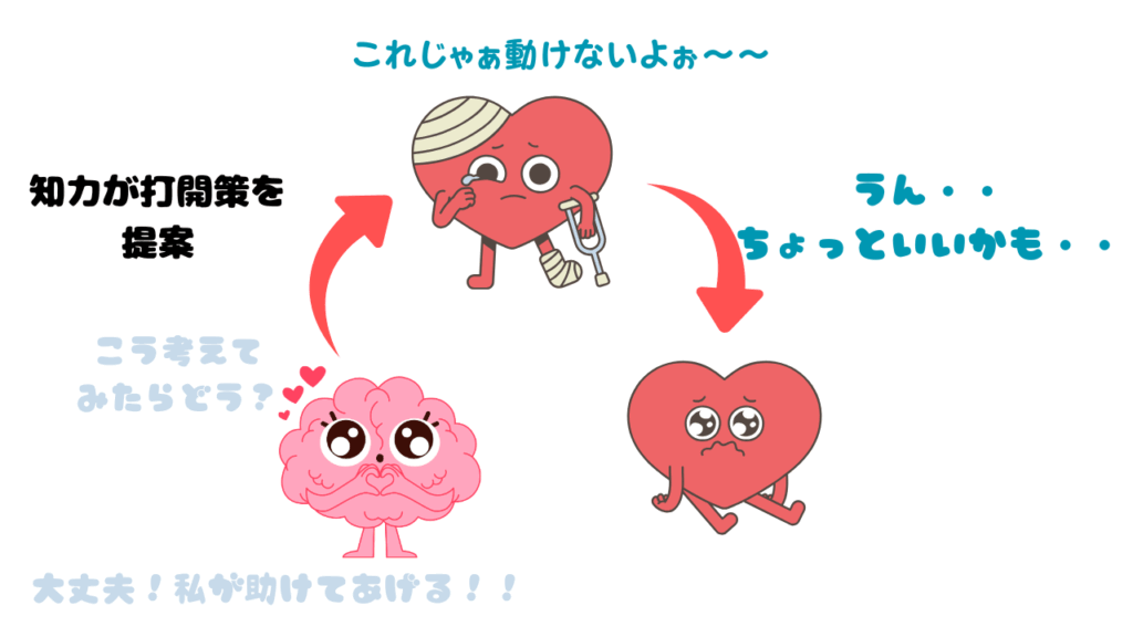 知力からもらった打開策を気力が受け取ることで、活力が発動し、行動に移せる!